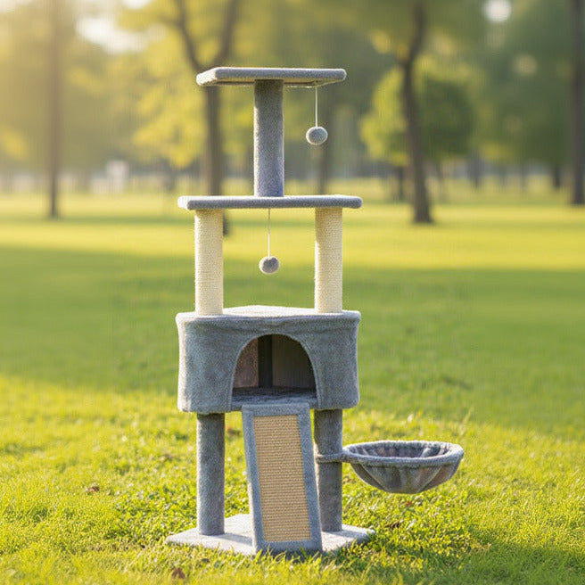 Luxusný 3-Poschodový Škrabací Strom pre Mačky – Sivý Plyšový s Pelechom
